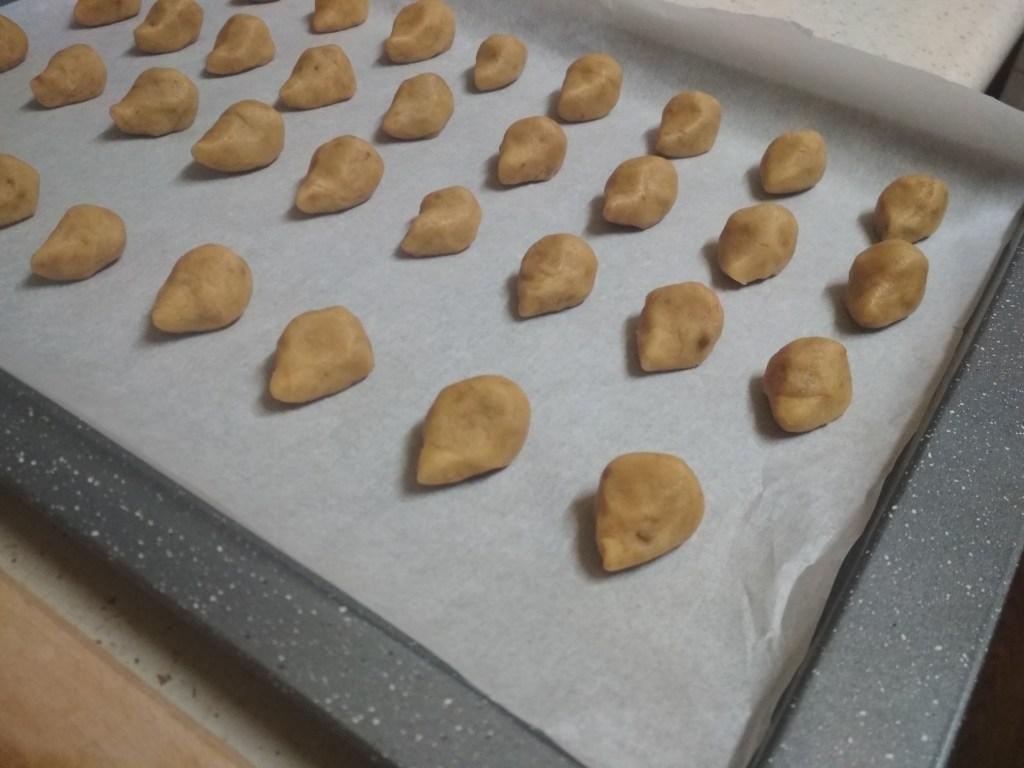 - Divide the dough into 50-60 pieces, or more as you wish. The smaller the hedgehogs, the cuter they are but are also more laborious to make. Put a piece of your favorite nut into each small lump and shape the hedgehog. If you choose almond halves for the insides, shaping will be easier. Narrow the front into a nose shape and make the back wider and round.