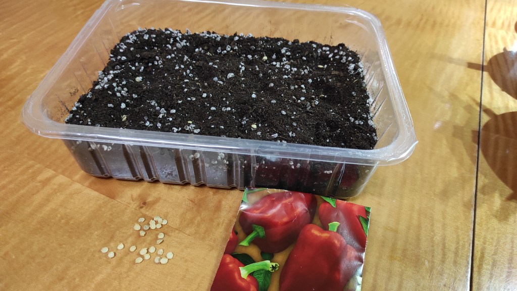 Osmnáctého února jsem zasela 12 paprik. Dala jsem je do plastové misky se supresivním substrátem, ve kterém se nemnoží mušky a jiná havěť. Miska je původně od masa, akorát jsem ji důkladně umyla. Poté jsem substrát s paprikami pořádně pokropila vodou pomocí postřikovače.